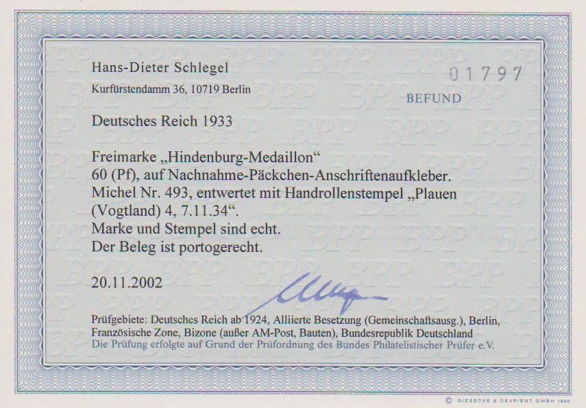 Hindenburg-Medaillon postfrisch, Attest A. Schlegel, teils sign. G. Schlegel. Mi. 1200,-