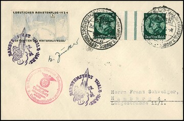 6 Pfg. Fridericus, Zwischensteg-Zusammendruck, nebst Zucker-Raketenflug-Vignette (und eigenhändiger Unterschrift) auf Raketenflugbrief aus Thale 1934, Mi. 140,- +