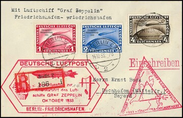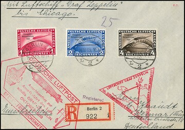 Chicagofahrt kpl. auf Zeppelinbrief (dieser leichte Gebrauchsspuren), R-Brief zur Chicagofahrt mit Anschlußflug (Sieger Nr. 238E), Mi. 1550,-
