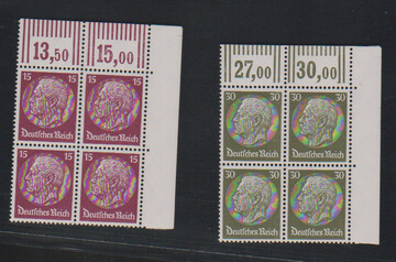 15 und 30 Pfg. Hindenburg-Medaillon, je postfrische Walzendruck-Viererblöcke aus der rechten oberen Bogenecke, Mi. 380,-