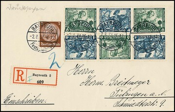 Wagner-Zusammendrucke 4/6/4 und 6/4/6 Pfg. jeweils als Kehrdrucke zusammenhängend, nebst 3 Pfg. Hindenburg, auf eingeschriebener Drucksache mit hierauf sehr seltenem Stempel "Bayreuth Festspielhügel" und entspr. R-Zettel, auch für den Musik-Thematik-Sammler eine Besonderheit!