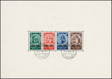 Nothilfe-Block postfrisch in sehr guter Erhaltung, im Rand drei winzige farbige Pünktchen, Attest Oechsner. Mi. 6000,-