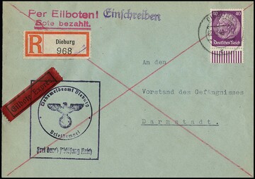 Hindenburg, fünf bessere Belege: Nr. 515 als EF auf unzulässiger Retour-Auslands-Drucksache, Nr. 522 als EF auf Zensur-Retourbrief, 9.5.40 (einen Tag vor Beginn der Offensive) nach Belgien, Nr. 524 als EF auf Eil-R-Brief "Frei durch Ablösung" (nur R-Gebühr frankiert, sonst portofrei), ferner als MeF auf Eil-Päckchen-Adresse, sowie Nr. 525 als EF auf Auslands-R-Brief zum Sonderporto nach Ungarn