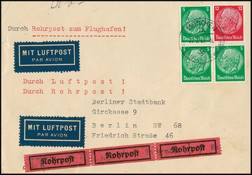 5(3) und 12 Pfg. Hindenburg auf Doppel-Rohrpostbrief, von München 1940 mit Rohrpost zum Flughafen, dann per Luftpost nach Berlin und dort innerorts ebenfalls mit Rohrpost befördert