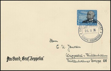 3 RM Flugpost, gute waagerechte Gummiriffelung, einzeln auf dekorativem Zeppelinbrief (SAF 1936), Mi. 1500,-
