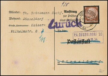 Hindenburg Trauer, drei bessere Belege: 3 Pfg. als EF auf Anschriften-Prüfkarte, 3 Pfg. im Eckrandpaar li. u. auf Postkarte, sowie motivbezogener Satz-R-Brief aus Tannenberg