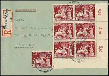 Sechs Briefe mit teils besseren Mehrfach-Frankaturen: Nr. 571 (Bogeneckenpaar), Nr. 574, 584y(4), 717(3), 816(7) und 903(2)