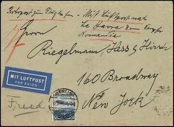 50 Pfg. Zeppelin, zwei seltene Einzelfrankaturen: auf Auslands-R-Brief in die CSR (Sonderporto, Couvert leichter Mittelbug ausserhalb, sign. Schlegel), sowie auf ungewöhnlichem Rohrpost-Lupo-Brief von Berlin in die USA, innerhalb Berlins per Rohrpost bis Flughafen, per Luftpost bis Le Havre und von dort weiter mit Dampfer