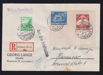 25 Pfg. Händel, Plattenfehler "1585" (Mi. 120,-), nebst linker oberer Bogenecke 5 Pfg. Hindenburg mit DZ "1", sowie Eckrandpaar 6 Pfg. HJ, auf R-Brief