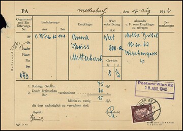 15 Pfg. Hitler vier seltene Einzelfrankaturen: auf Adresse einer Feldpost-Drucksache, auf Zensur-Lupo-Auslands-Drucksache (etwas "eckrund"), auf Zahlkarte (spät 2.5.45) und auf Postformular "Gebührenmeldung" für zu wenig bezahltes Porto für ein Paket (aus Wien), ein Befund Schlegel