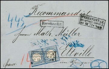 7 Kr. blau, Prachtpaar auf Einschreibebrief der 2. Gewichtsstufe mit Ra3 "Frankfurt a.M. Stadtpost-Exp. No. 2" (und kleinen Tintenspuren) nach Eltville, ein Klappenteil rs. gering verkürzt