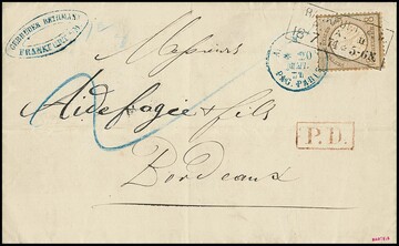 18 Kr. ockerbraun (ein kurzer Zahn bzw. kl. Spalt) als seltene Einzelfrankatur auf sauberem Auslands-Doppelbrief von Frankfurt 1874 nach Bordeaux, Frankreich, Attest Krug. Mi. 4500,-