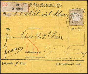 18 Kr. ockerbraun, Kabinettstück mit klarem K1 "Weinheim 22/8 74" auf gef. gelber Paketkarte (Bestimmungsort radiert). Eine seltene Einzelfrankatur, Fotoattest Krug. Mi. 5000,-