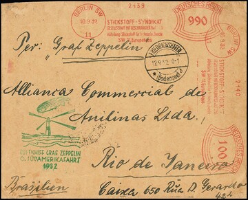 6. SAF 1932, Brief mit hohen Absenderfreistempeln "990" und "100" ab Berlin, Auflieferung Friedrichshafen, bis Rio de Janeiro, reiner Bedarf mit entspr. Gebrauchsspuren