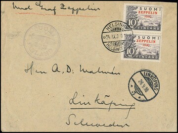 Ostseefahrt 1930, Brief finnische Post ab Helsinki mit zwei Zeppelinmarken zu 10 M.