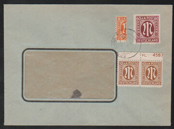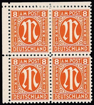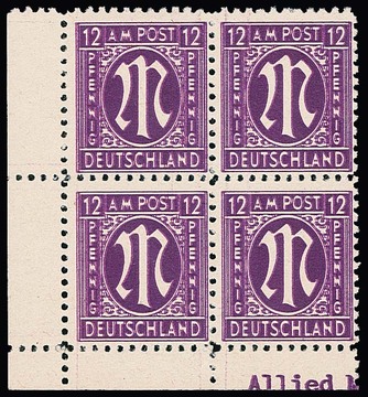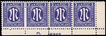3 Pfg. AM-Post, zentr. gest. Oberrand-Viererblock mit Pl.-Nr. "45865", Fotoexp. Hettler. Mi. 120,-