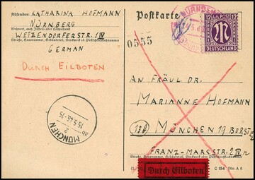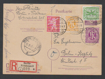 6 und 12 Pfg. AM-Post in Mischfrankatur mit SBZ 5 und 12 Pfg. Berliner Bär, auf Orts-Einschreibekarte (Hitlerkarte im Aufbrauch) von Berlin-Friedenau, 14.9.45, nach Steglitz