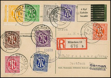 Amerikanischer Druck, kpl. Serie auf Aufbrauchs-Ganzsachenkarte 6 Pfg. auf Hitler aus der französischen Zone (PB803, OPD Freiburg), als Sammler-R-Karte von München retour nach Freiburg (o.T.)