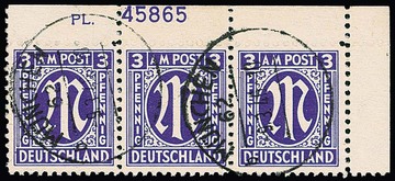 3 Pfg. AM-Post im gestempelten Dreierstreifen aus der rechten oberen Bogenecke mit Pl.-Nr. "45865", oben nicht vollständig gezähnt (die Zahnspitzen berühren nur das Papier), Kuriosum, Fotoexp. Hettler
