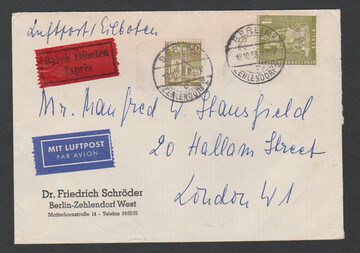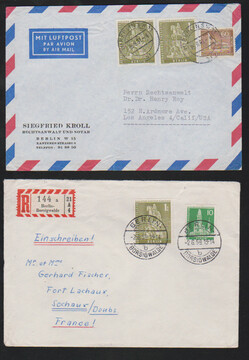 Stadtbilder, 24 bessere portogerechte Briefe je mit "Berlin"-Verwendungen, u.a. 15 Pfg. per vier als MeF auf Orts-R-Brief, 25 Pfg. im Dreierstreifen auf Lupo-R-Brief, 40 Pfg. im waager. Paar auf Überseebrief, waager. Viererstreifen 60 Pfg. (nebst 20 Pfg. Heuss) auf Lupobrief nach Venezuela, 70 Pfg. EF, sowie acht Briefe mit MiF 1 DM, u.a. zweimal per zwei