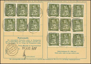 1 DM Großer Kurfürst per 15, dabei fünf waagerechte und ein senkrechtes Paar, auf kompletter Postsparkarte von Berlin-Schlachtensee, 4.2. und 22.5.59, Attest Eliades, selten!