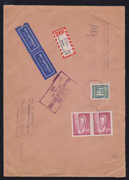 3 DM Kongreßhalle im senkrechten Paar, nebst 30 Pfg., auf portoger. Lupo-R-Brief, 108gr., aus Berlin 1960 in die USA
