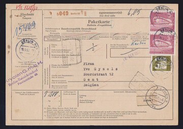 3 DM Kongreßhalle im senkrechten Paar, nebst 5 Pfg. Bedeutende Deutsche, auf kpl. Auslands-Paketkarte ab Berlin N 65, 15.9.62, nach Belgien