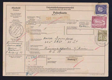 3 DM Kongreßhalle in sämtlich verschiedenen Mischfrankaturen auf vier kpl. Auslands-Paketkarten ab Berlin