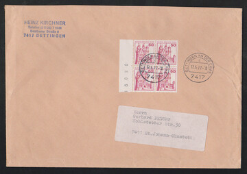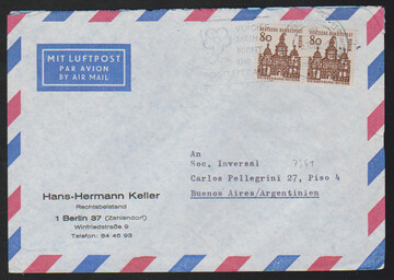 80 Pfg. kleine Bauwerke im waager. Paar als seltene MeF auf Übersee-Lupobrief (Mi. alleine 350,-), ferner Paar 50 Pfg. in MiF auf Brief, R-Brief mit drei OR-Stücken 20, 50 u. 100 Pfg. Brandenburger Tor, sowie 30 Pfg. als RE + 4 LF auf Brief
