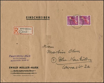40 Pfg. Rotaufdruck im Paar als gute Mehrfach-Frankatur-Variante auf Orts-R-Brief (typische Gebrauchsspuren wie Mittelfalte ausserhalb) der 5. Gewichtsstufe (ab 250gr.) ab Berlin-Lankwitz, 4.4.49