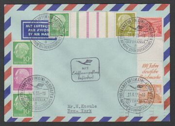 20 u. 4 Pfg. Bauten, senkrechter Reklame-Zwischensteg-Zusammendruck, nebst Bund-Heuss-Zus.-Dr. WZ14 und S26, auf Lupo-Erstflugbrief 1955 nach New York mit rs. Ankunftsstempel. Mi. 246,-