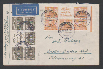 2 bis 4 Pfg. Bauten je im Zusammendruck-Dreierstreifen ("100 Jahre deutsche Briefmarken") nebst weiteren 1 und 4 Pfg. auf Lupobrief ab Wolfsburg 1951 nach Berlin, Mi. 205,-