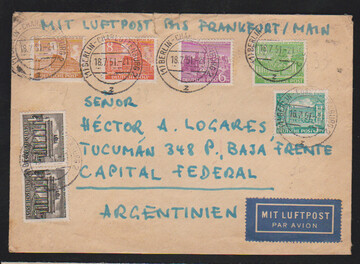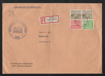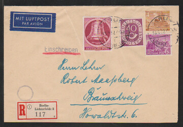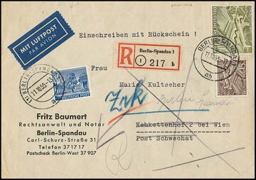 Bauten, 13 bessere Belege inkl. Nr. 42-47 auf Lupo-Überseebrief, 42-47 u. 50 auf R-Brief, Nr. 44 u. 51 auf Lupo-Auslandsbrief, 44 u. 55 auf Lupo-Eilbrief, Nr. 48 EF auf Streifband, Nr. 48 u. 123 auf Lupo-Eilbrief, 50 u. 57 auf Lupo-Eil-R-Brief, 51 u. 64 auf Lupo-Auslandsbrief, 54(2) u. 64 auf Lupo-Eil-R-Brief, 56 zwei EF auf R-Doppelbriefen, sowie Nr. 57/58 auf Sammler-R-Brief, alle aus Berlin