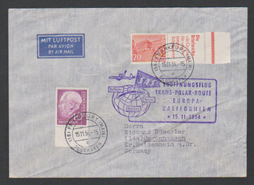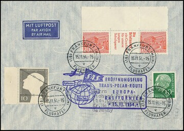 20 Pfg. Bauten, waagerechter Reklame-Zusammendruck "Die Briefmarke", nebst ZuF, auf portoger. Erstflug-Lupo-Brief 1954, Mi. 600,-