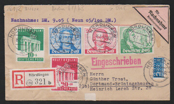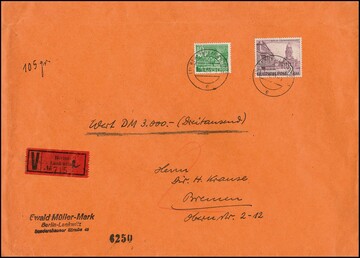 2 DM Bauten je in Mischfrankatur auf drei portoger. Belegen: nebst 10 Pfg. Bauten auf Wertbrief (von Müller-Mark) aus Berlin-Langwitz, 13.1.55, ferner nebst 30 Pfg. Männer auf Auslands-R-Brief der 8. Gewichtsstufe (typische Gebrauchsspuren) mit Zensur nach Schweden, sowie nebst 20 Pfg. auf Lupo-Eil-Expreßbrief-Adresse, je ab Berlin, seltene Portostufen!