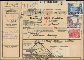 5 und 2 DM Bauten, nebst 20 Pfg., vs., rs. 15 Pfg., auf kpl. Auslands-Paketkarte von Steglitz 1952 nach Belgien