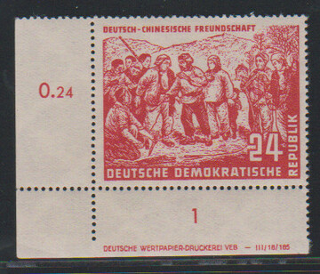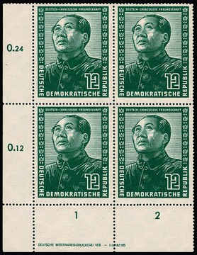 12 Pfg. Deutsch-Chinesische Freundschaft im postfrischen Viererblock aus der linken unteren Bogenecke mit kpl. Druckvermerk. Mi. 880,- +