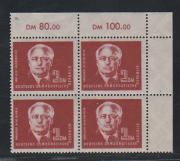 Pieck in postfrischen Eckrand-Viererblöcken, dabei 5 Mk. links unten mit DZ, je ein Wert sign. Ruscher. Mi. 580,- +