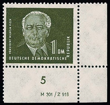 24 Pfg. Pieck in besserer Farbe (sign. Schönherr), sowie 1 DM als rechte untere Bogenecke mit Druckvermerk, je postfrisch. Mi. 310,-
