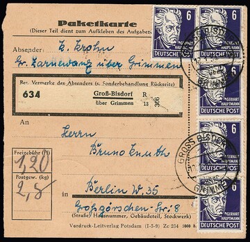 6 Pfg. Köpfe II 20mal vs./rs. als Mehrfach-Frankatur auf Paketkarte aus Groß-Bisdorf (ein Wert ein Fehlzahn), seltene hohe MeF!