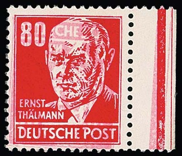 80 Pfg. Thälmann Lack vom linken Bogenrand (oben am Rand kleine Tönung), nebst 24 Pfg. Pieck, auf portoger. gelaufenem Expreßbrief von Halle nach Klostermansfeld 1953, Mi. 2400,-. Attest Schönherr: "Die Marken befinden sich in einwandfreiem Zustand."