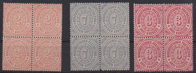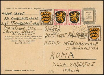 Sieben bessere Belege der Allgemeinen Ausgabe: Nr. 1 per sechs auf Drucksache, Nr. 2 Bogeneckenpaar Bru auf Drucksache, Nr. 2(2) und 5 auf seltenem "Geschäftspapier", Nr. 3(2) und 6(2) auf P836a als Auslandskarte nach Rom, Zwischenstegpaar Nr. 4 auf "Geschäftspapier", Nr. 4, 7(2), 8, 10 u. 11 auf Expreß-R-Doppelbrief, sowie Nr. 10(3) als gute MeF auf Paketkarte
