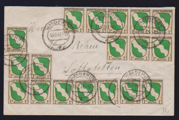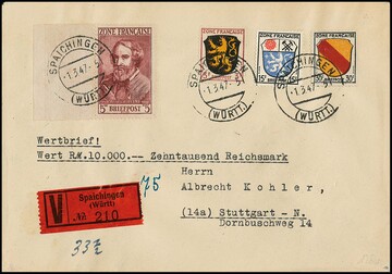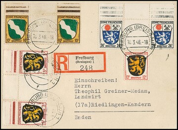 10, 3 und 24 Pfg. je im Oberrand-Zwischenstegpaar, nebst 12 Pfg., in ungewöhnlicher Verwendung auf eingeschriebenem Streifband aus Freiburg 1946, 10 Pfg. zuviel, aber Zwischenstegpaare der 10 Pfg. auf Ganzstück sind selten!