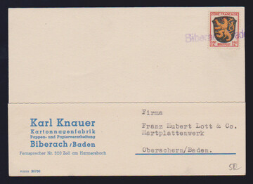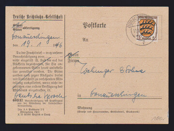5 Pfg., gute Einzelfrankatur auf Bedarfs-Ortskarte aus Donaueschingen 1946, Mi. 250,-