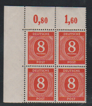 8 Pfg. orangerot im postfrischen Plattendruck-Viererblock aus der linken oberen Bogenecke, dgz, Fotoexp. Bernhöft. Mi. 416,- +