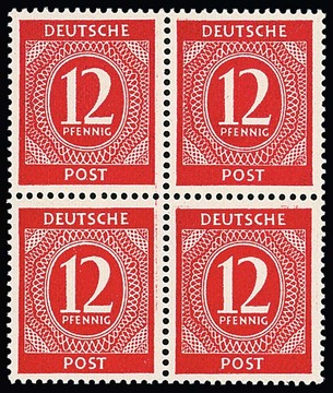 12 Pfg. karmin, vier "Februar-Briefe", aus Hofgeismar 11.2.46 (lt. Michel-Briefe-Katalog Ersttag, Marke "eckrund"), München 15.2.46, Münchberg 20.2.46 und Frankfurt 21.2.46, je Fotoexp. Schlegel