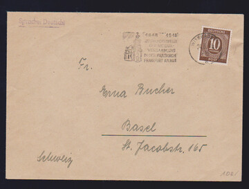 10 Pfg. als gute Einzelfrankatur auf Auslands-Drucksachen-Couvert von Wiesbaden 1948 in die Schweiz