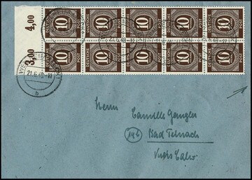 10 Pfg. im Zehnerblock als gute 10-fach-Mehrfach-Frankatur auf Postscheckbrief aus Dillenburg, 22.6.48