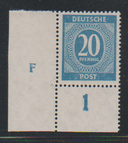 20 Pfg., postfrische linke untere Bogenecke mit Druckerzeichen "F", Fotoexp. Bernhöft. Mi. 250,-