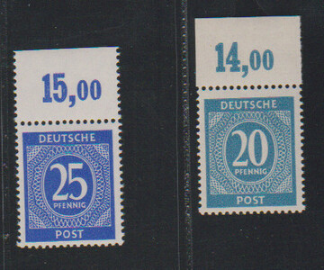 20 Pfg. grauultramarin (ndgz) und 25 Pfg. (dgz), je postfrische Plattendruck-Oberrandstücke, sign. ArGe bzw. Fotoexp. Bernhöft. Mi. 330,-